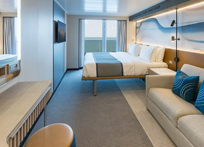 MB - Club Suite Forward-Facing s balkónom 22 - 25 m² / balkón 7 m². 9. až 13. paluba - vpredu. Max 2 osoby. Výhody Club. 5 806 € 2 903 € za osobu